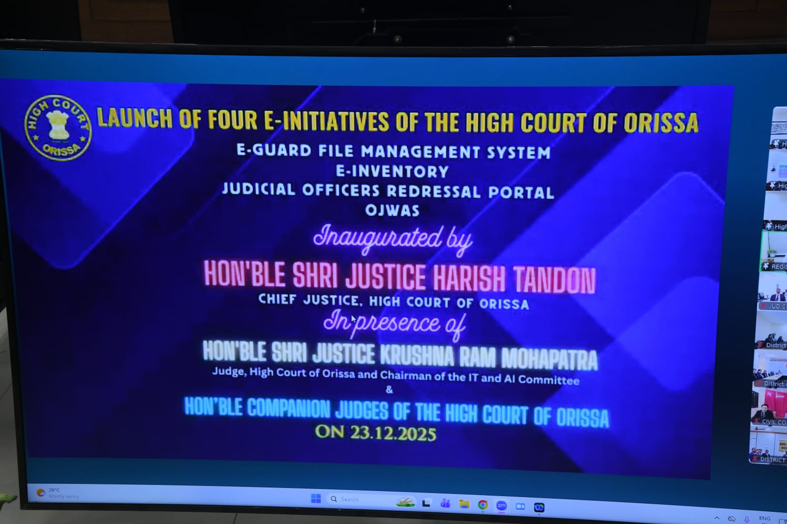 | 23.12.2025 - On 23rd Day of December, 2025 at VC Hall, 2nd Floor, Hon'ble Shri Justice Harish Tandon, Chief Justice, High Court of Orissa launched the e-Guard File Management System, e-Inventory, Judicial Officers' Grievance Redressal Portal and OJWAS (Odisha Judicial Workflow and Automation System) in pilot District Courts of Cuttack, Khurda, Puri, Dhenkanal, and Boudh in virtual mode, in presence of Hon'ble Shri Justice K.R. Mohapatra, Judge, High Court of Orissa & Chairman, IT & AI Committee & Hon'ble Companion Judges of the High Court of Orissa. |