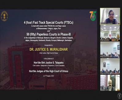 | 01.08.2023 - On 1st Day of August, 2023 at 9.30 AM, Dr. Justice S. Muralidhar, Chief Justice, High Court of Orissa inaugurated 4 (four) newly established Fast Track Special Courts (FTSCs) to deal with cases under POCSO Act and Rape cases and 50 (fifty) numbers of Paperless Courts in Phase-III in virtual mode in the presence of Hon’ble Shri Justice S. Talapatra, Chief Justice - Designate and the Companion Judges of the High Court of Orissa. |